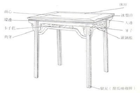 方桌在传世家具中最为多见,有大中小之别,俗称“八仙”“六仙”和“四仙”。这种“一腿三牙罗锅枨”式方桌,是明代家具中最为标准的一种方桌形式,因每一条腿与三块“牙子”相交,下又有“罗锅枨”而得名。罗锅枨也叫桥梁枨,一般用于桌、椅类家具之下连接腿柱的横枨,因为中间高拱,两头低,形似罗锅而得名。